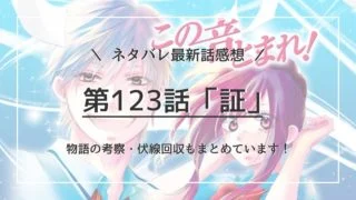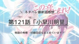『この音とまれ!』漫画『この音とまれ!』ネタバレ 最新話感想 第121話「小早川明里」 漫画『この音とまれ!』 第121話「小早川明里」についてのネタバレ・最新話感想・考察・伏線回収をまとめた記事です。 2023.02.12『この音とまれ!』ネタバレ 最新話感想
